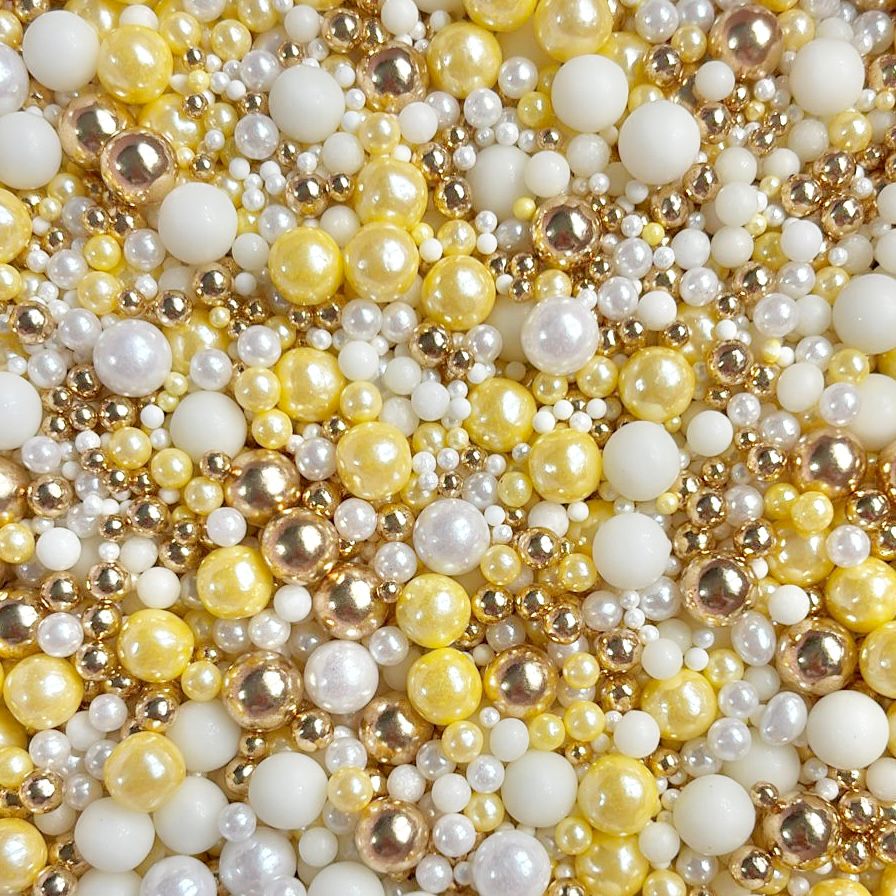 Yellow Pearlescent 2mm, 4mm & 7mm Mix Pearls (C) - Glucose, sugar, corn starch, maltodextrin, essence (glucose, silica, vanillin, Ethyl maltol), colour E102.